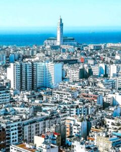 A modern city with iconic architecture, including the Hassan II Mosque overlooking the Atlantic Ocean.